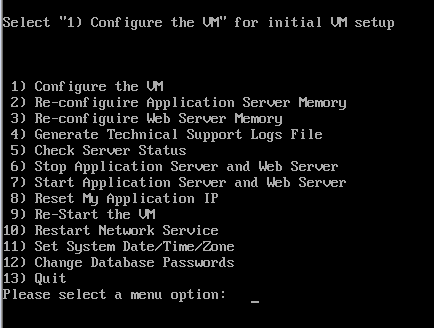 1. Please select a menu option: 6 < enter > {wait 3-5 minutes}. You can run option 5) to monitor the status.2. Once the App/Web Server has shutdown select a menu option: 1) < enter > Configure the VM
